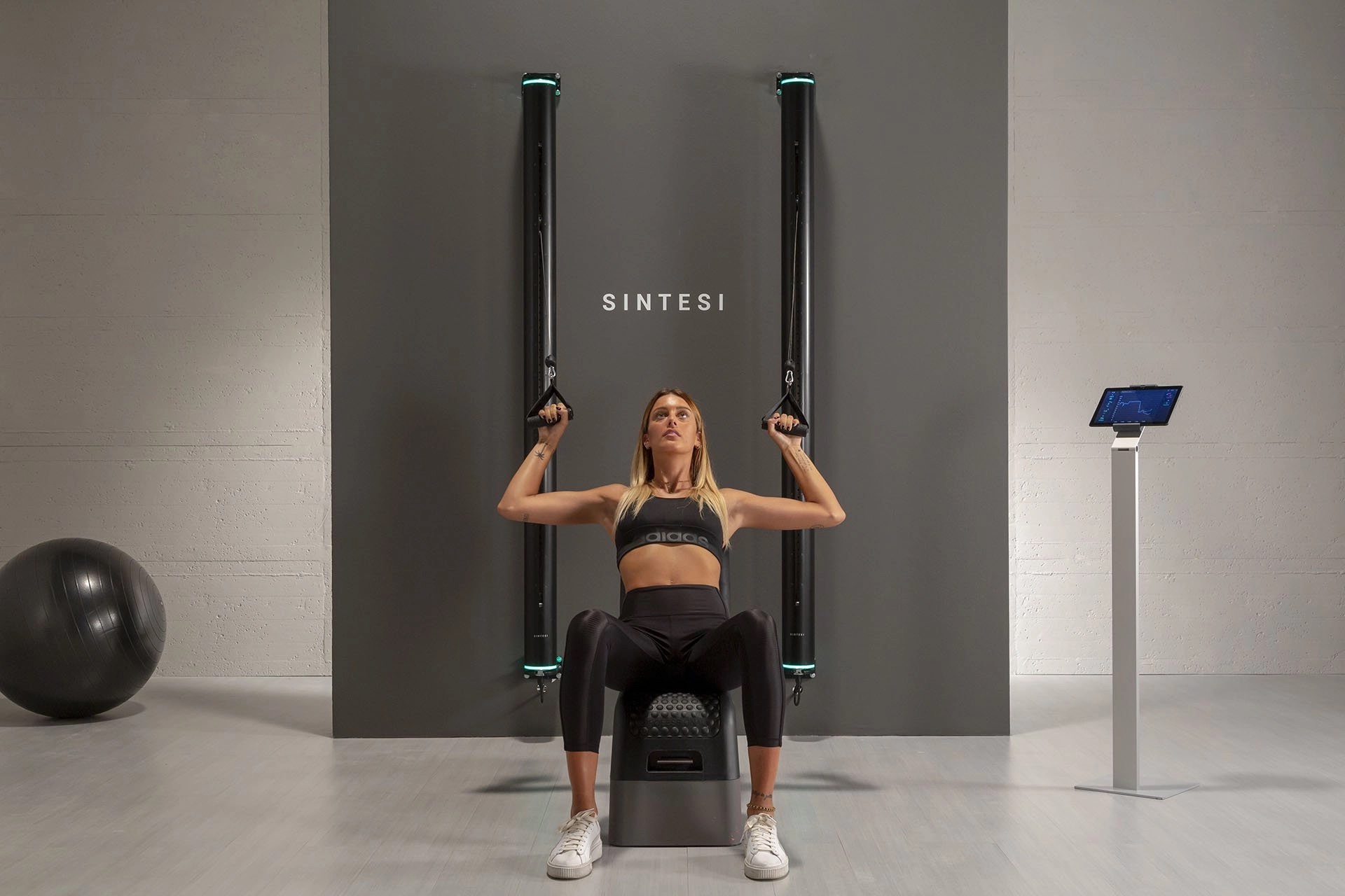 Il prodotto ammiraglia di Akuis si chiama Sintesi, una macchina robotizzata/digitale dalla straordinaria multifunzionalità in cui una serie di motori elettrici, a risparmio energetico, sostituiscono i classici pesi.